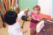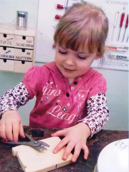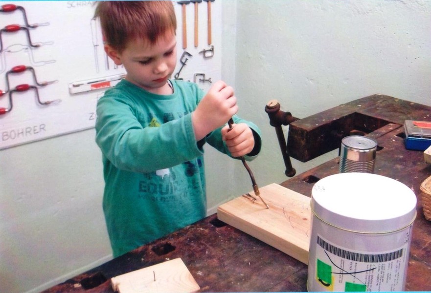 Was in der Schule der Werkunterricht fortsetzt, beginnt bei uns in der hauseigenen Werkstatt. Hier kann man sich ausprobieren und sägen, hämmern und Werkzeuge austesten.