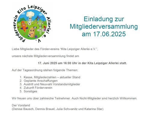 unsere nächste Mitgliederversammlung findet statt am 26.06.2024 in der Kita Leipziger Allerlei.