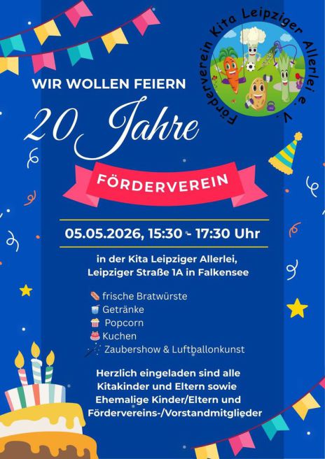 Wir finden das ist ein Grund zu Feiern und laden alle aktuellen und ehemaligen Kitakinder, Eltern und Fördervereinsmitglieder sowie -vorstandsmitglieder ein.